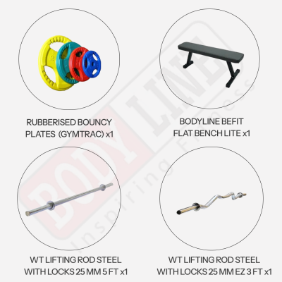 Rubberised Bouncy Plates (Gymtrac) I Befit Flat Bench Lite I Wt Lifting Rod Steel With Locks (25 Mm 5 Ft, 25 Mm Ez 3 Ft) I Jump Rope I Push Up Bar Jf7700 - Vector X I IR94025 - 14" Regular Hollow Bar I Adjustable Hand Grip